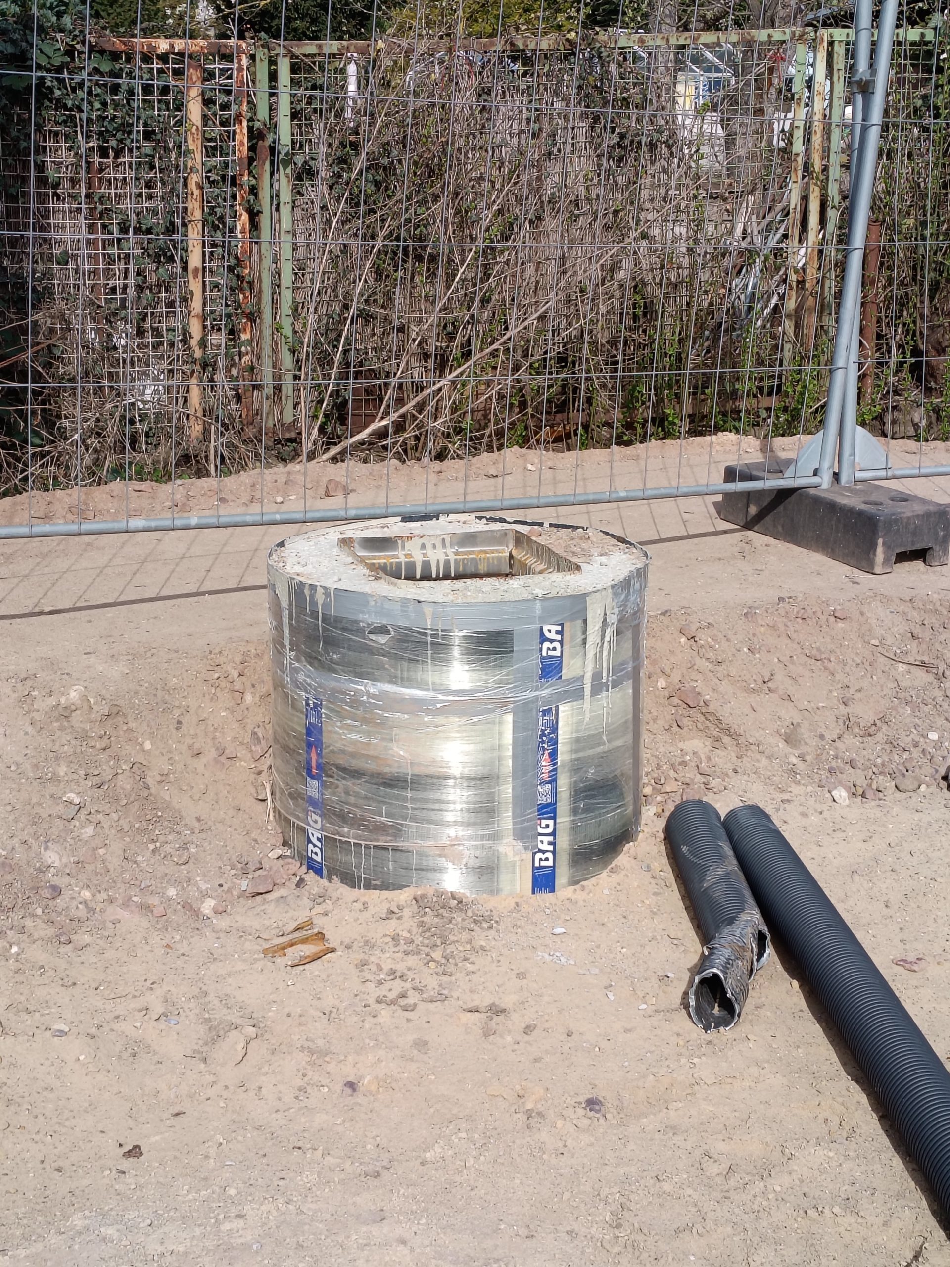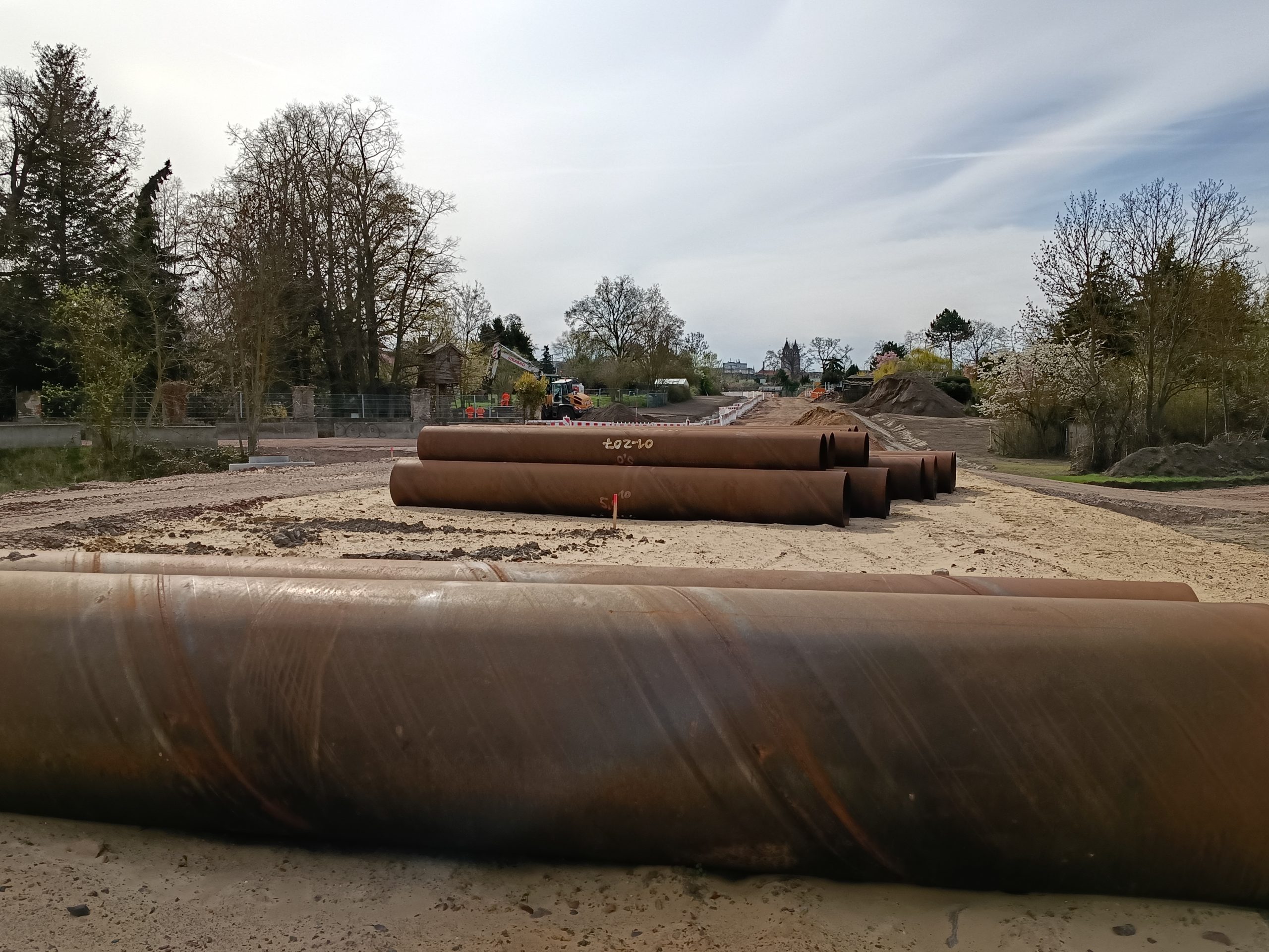 Unter Fahrbahn und Gleistrasse wurden bereits im Vorfeld zahlreiche Hausanschlüsse verlegt. Auffällig ist derzeit eine große Lücke in der Lärmschutzwand am Magdeburger Ring: Hier wurde eine beschädigte Abwasserleitung erneuert. Nach Abschluss der Arbeiten wird die Lärmschutzwand wieder geschlossen.