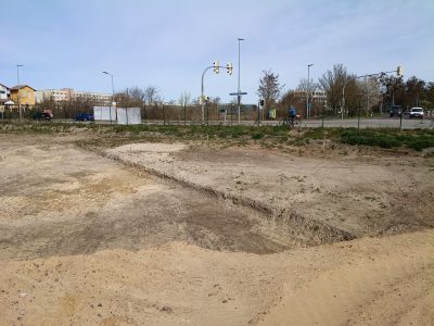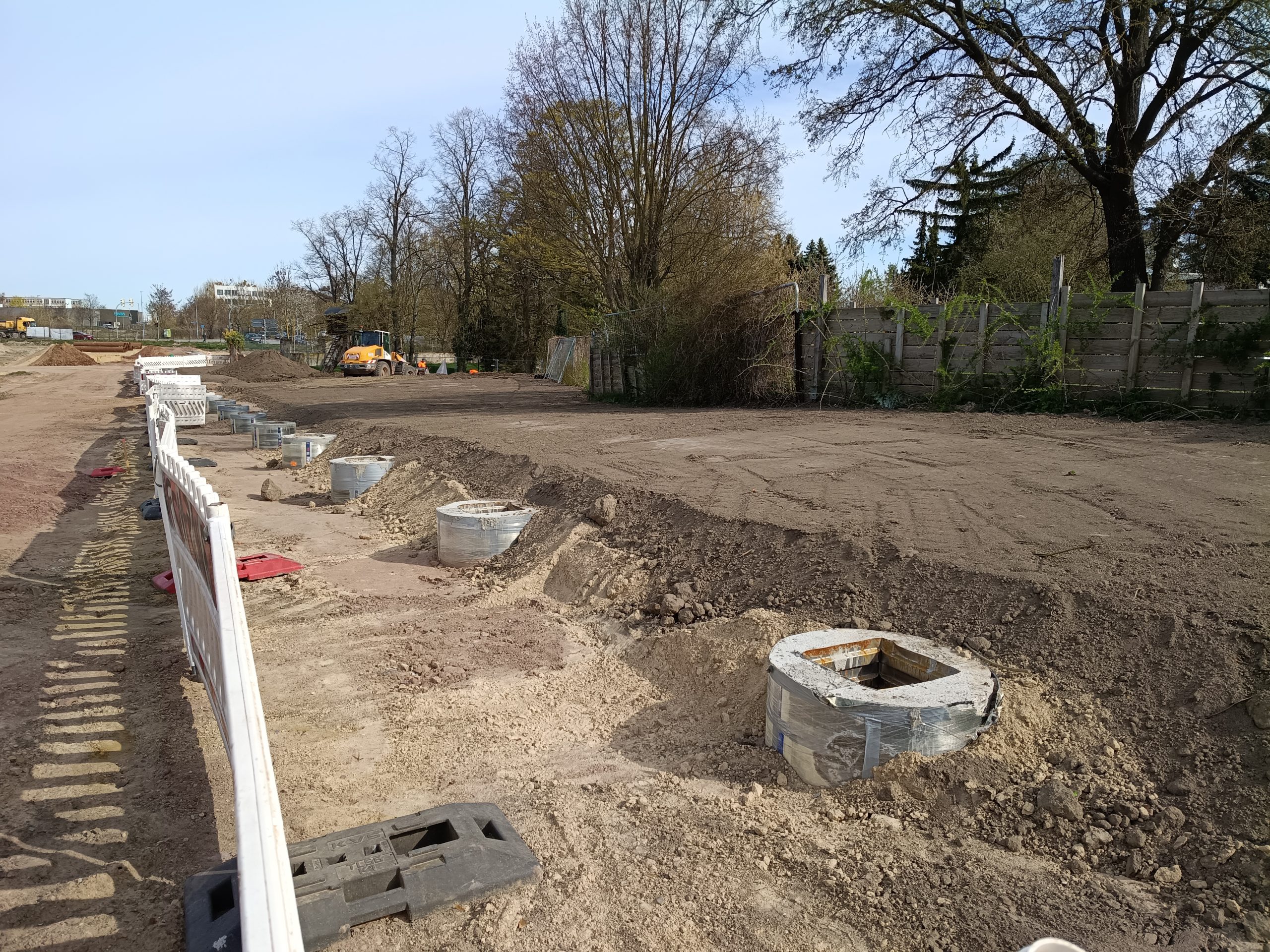 Ab Mai beginnen die vorbereitenden Arbeiten für den Bauabschnitt über die Albert-Vater-Straße. Wichtig für alle Verkehrsteilnehmenden: Die Straße bleibt während der gesamten Bauzeit befahrbar, der Verkehr wird an den jeweiligen Baufeldern vorbeigeführt. Auf der gegenüberliegenden Seite haben die Arbeiten zur Baufeldfreimachung bereits begonnen.